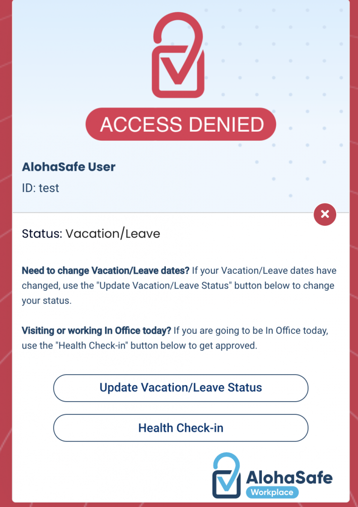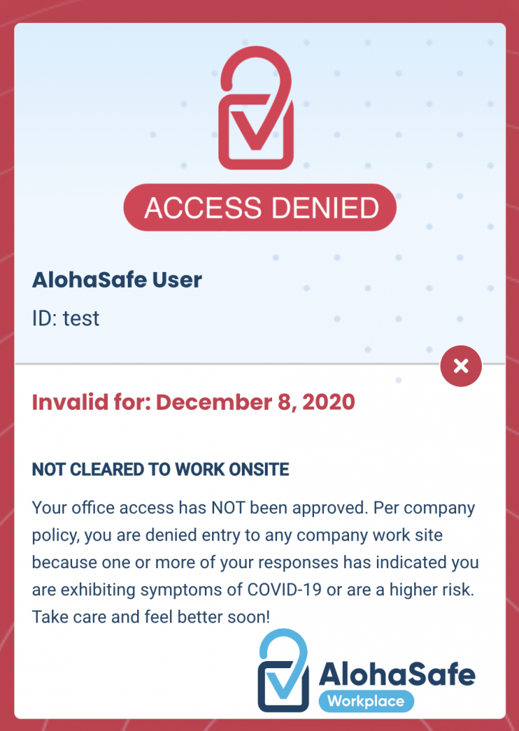 - If an employee has been deemed high risk of transmitting COVID-19 (based on screening survey responses) they will automatically receive a red “Access Denied” badge and are prohibited from entering the workplace.