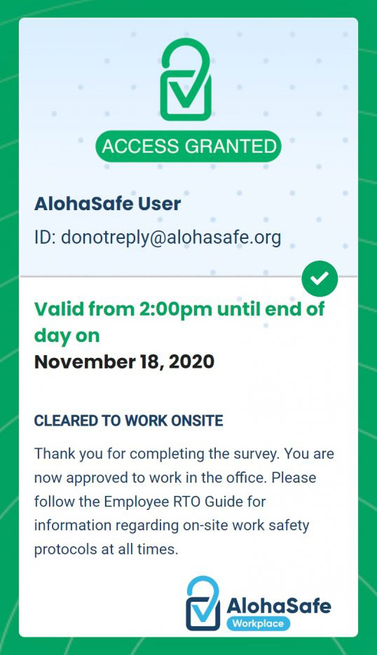 AlohaSafe Workplace is a simple yet powerful digital COVID-19 screening solution that local businesses can leverage to safely reopen and protect the health and safety of employees, clients, customers, and the wider community. Companies using AlohaSafe Workplace require employees and vendors to have a valid badge to enter the office or work site.