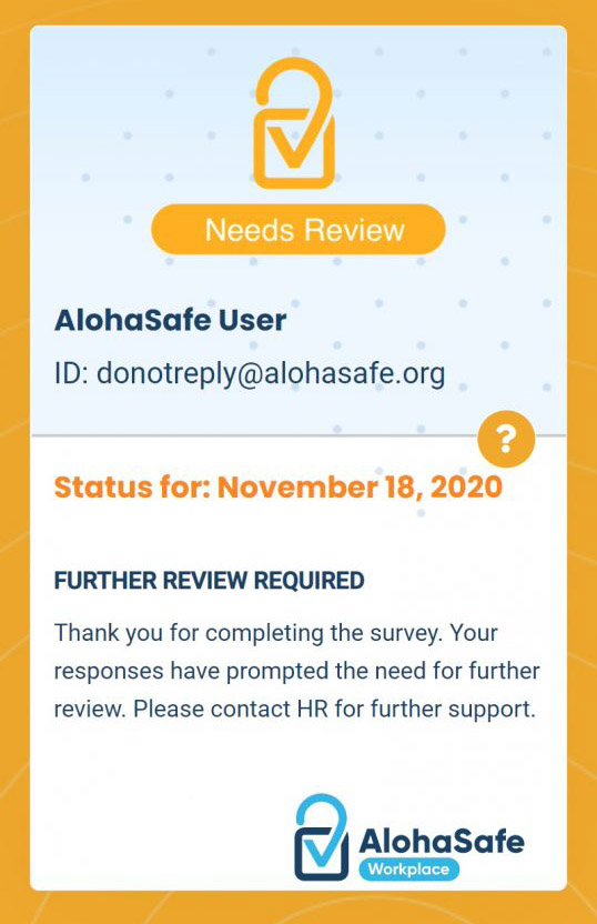 Employees will receive a yellow “Needs Review” badge if the results indicate that the employee has identified experiencing some symptoms, may have had recent exposure or may have recently traveled. Employees who receive a “Needs Review” badge will be prompted to follow up with their employer to receive guidance on next steps.