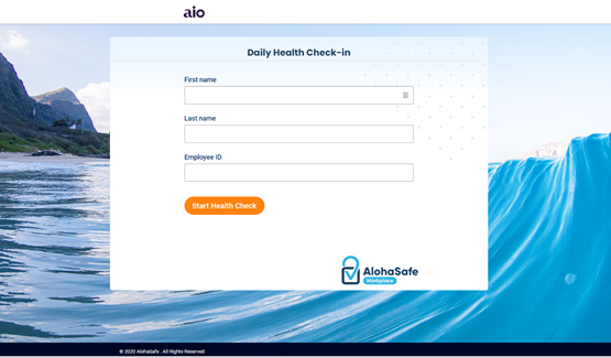 If this is your first time using AlohaSafe WorkPlace, click on the link provided by your HR/administration department in your welcome email. You will be prompted for your first and last name as well as your employee ID.